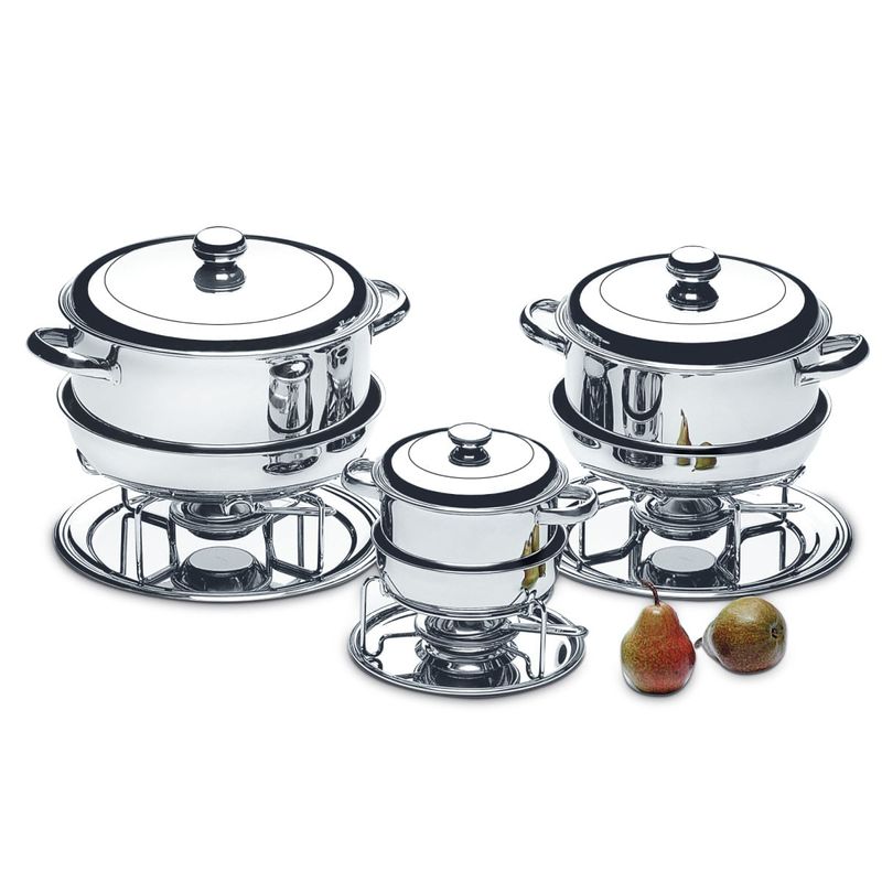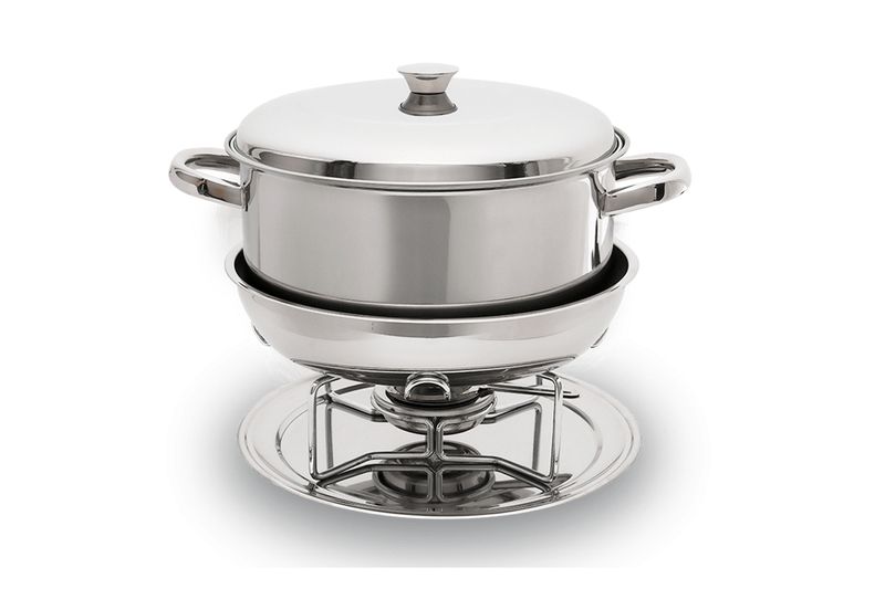 O Rechaud Plátanos tem Caçarola Funda e Tampa de Aço Inox, um material higiênico e neutro, ideal para ser utilizado em contato com os alimentos. Possui capacidade para 8 Litros e vem com um Suporte Cromado, um Fogareiro de Aço Inox Grande e com Abafador e uma Cuba para Banho Maria. Tudo isso sobre um Prato de Aço Inox com 30,5 centímetros de diâmetro. Um conjunto completo para servir a comida aquecida e com muita elegância.