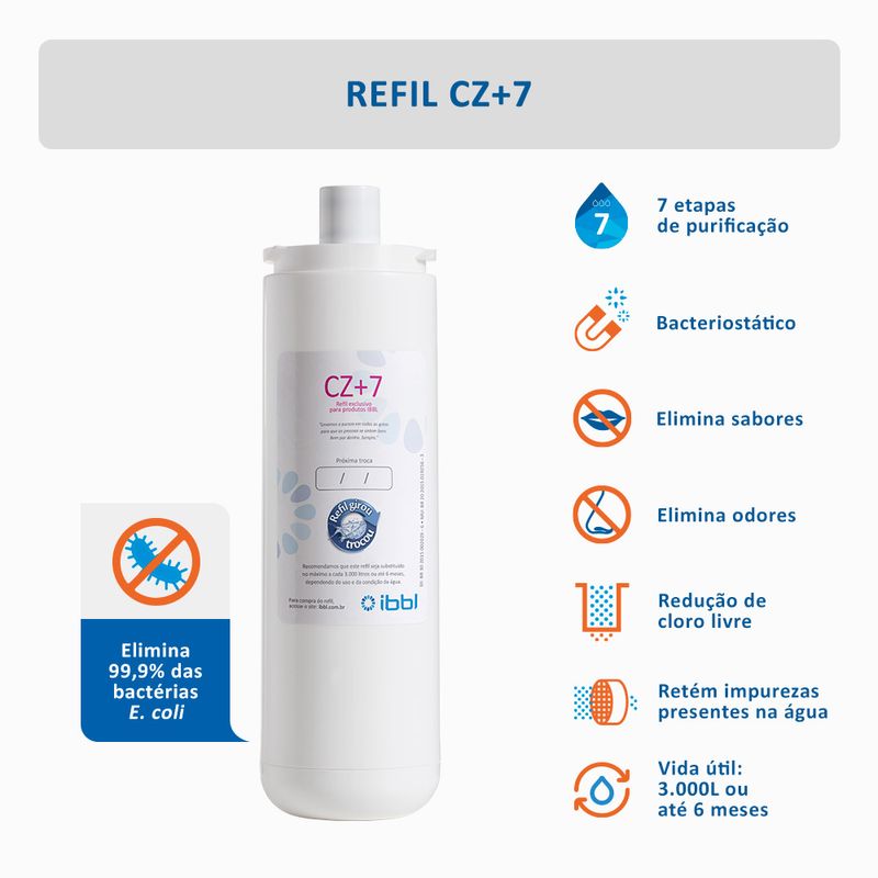 O Refil Girou Trocou CZ+7 possui 7 etapas de purificação, que retém as impurezas da água como barro, ferrugem e sedimentos; reduz o cloro e elimina sabores e odores indesejáveis da agua; além disso ainda elimina bactérias, possui eficiência bacteriológica e ação bacteriostática que controla a proliferação de bactérias. Prático sistema refil GIROU TROCOU garante ao usuário uma fácil substituição do refil e manutenção do equipamento. Esse refil pode se usado em todos os purificadores refrigerados IBBL.