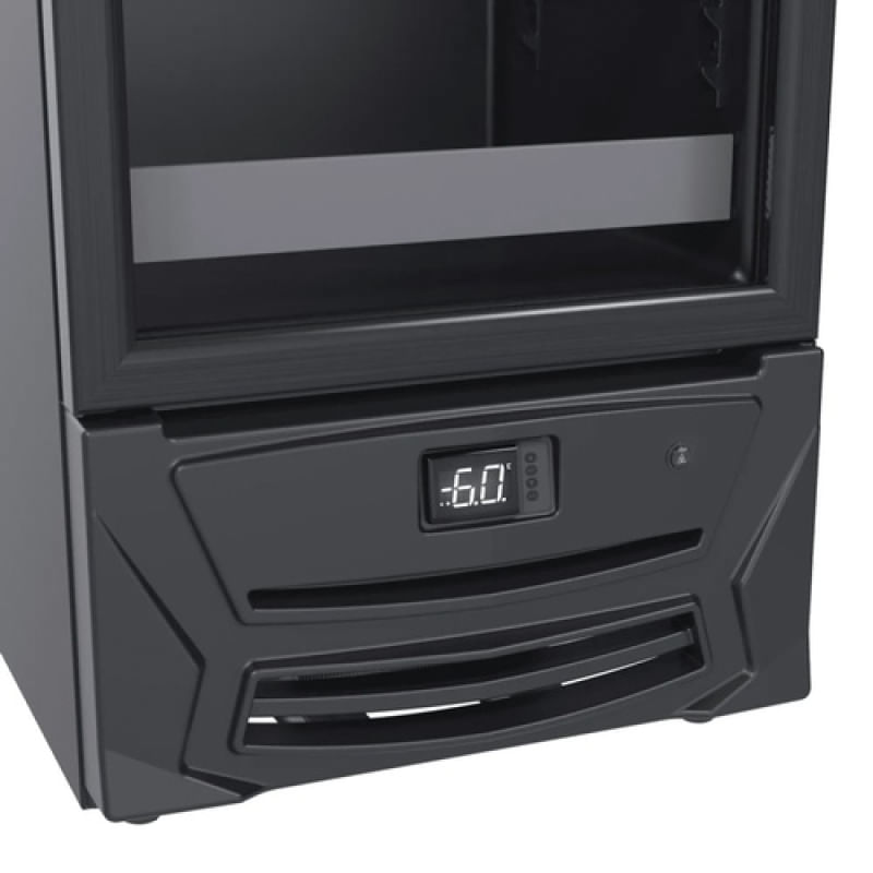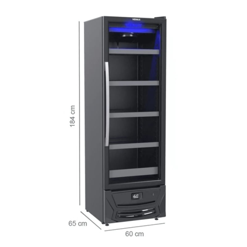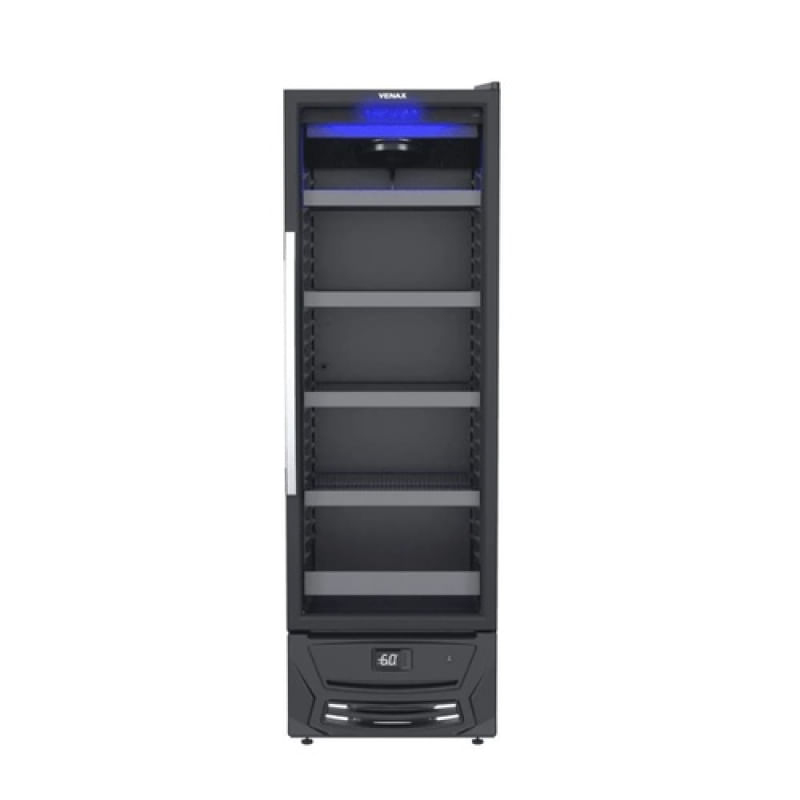 Refrigerador Expositor EXPVBL330, com porta de vidro duplo Low-E com aquecimento, capacidade para 120 Garrafas 600 ml, porta de vidro com aquecimento, puxador em alumínio escovado, controle de temperatura digital regulável de -6ºC até 6ºC, iluminação interna em LED na cor azul, prateleiras 4 prateleiras reguláveis, com sistema de refrigeração por compressor.