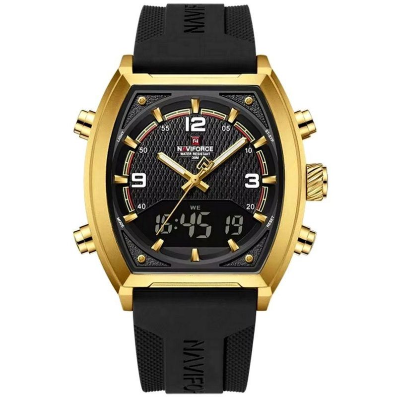 Relógio Digital Masculino Pulseira De Silicone Quartzo Tonneau Duplo Display Esportivo Preto Dourado