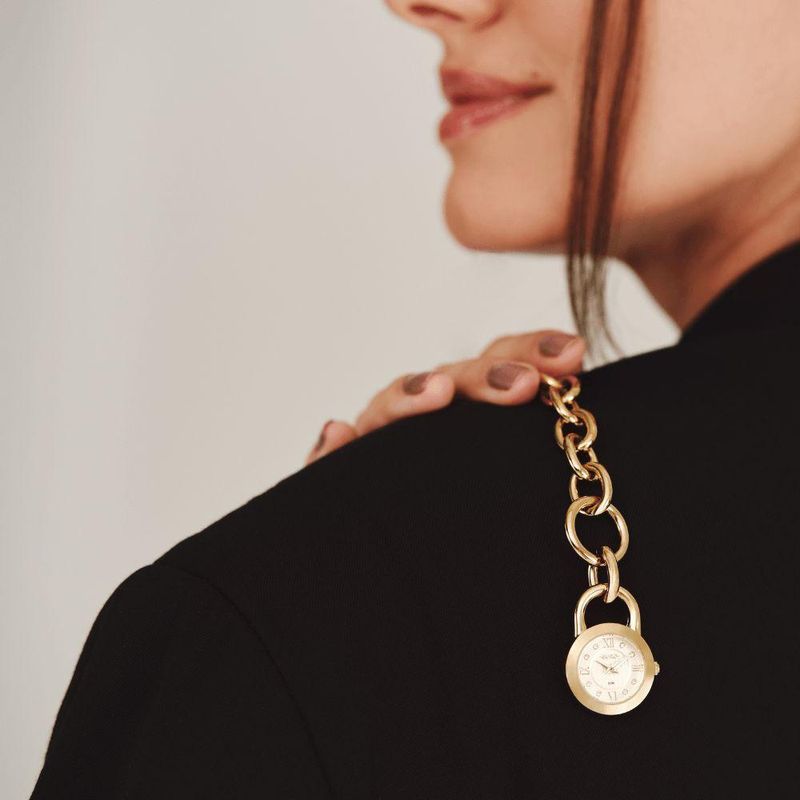 A coleção Chains chega para marcar a tendência das correntes com um relógio inovador estilo pulseira com a caixa como pingente, conectando a expressividade das correntes com a força feminina! Seu fecho é em formato diferenciado podendo utilizar de diversas formas para você ousar no estilo e entrar no universo da moda. Banho dourado e mostrador redondo.