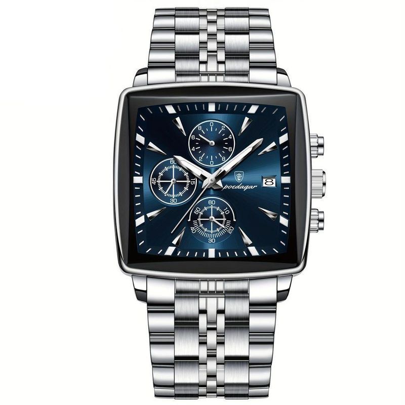 Relógio Quadrado Em Aço Inoxidável Para Homens Com Cronógrafo À Prova Da Água Azul