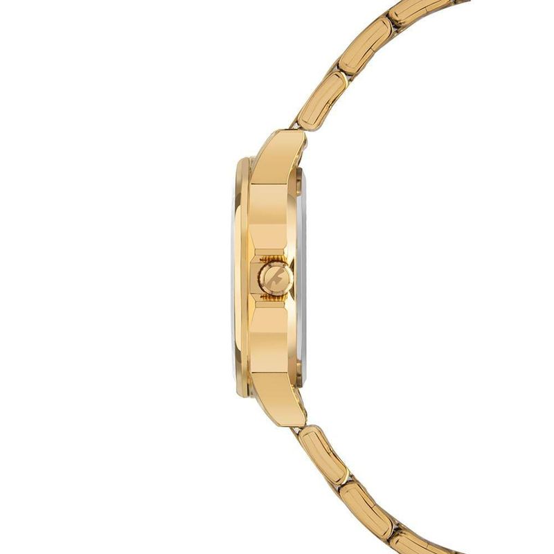 Relógio Boutique conta com um design clássico e mostrador de fácil leitura texturizado na cor champanhe, contando com aplicação de pedras nas marcações de hora, e numeração romana. Produto 100% em aço inoxidável, com pulseira de aço inoxidável em 5 links com banho em dourado, máquina quartz Japonesa Miyota e resistência à água de 50 metros.