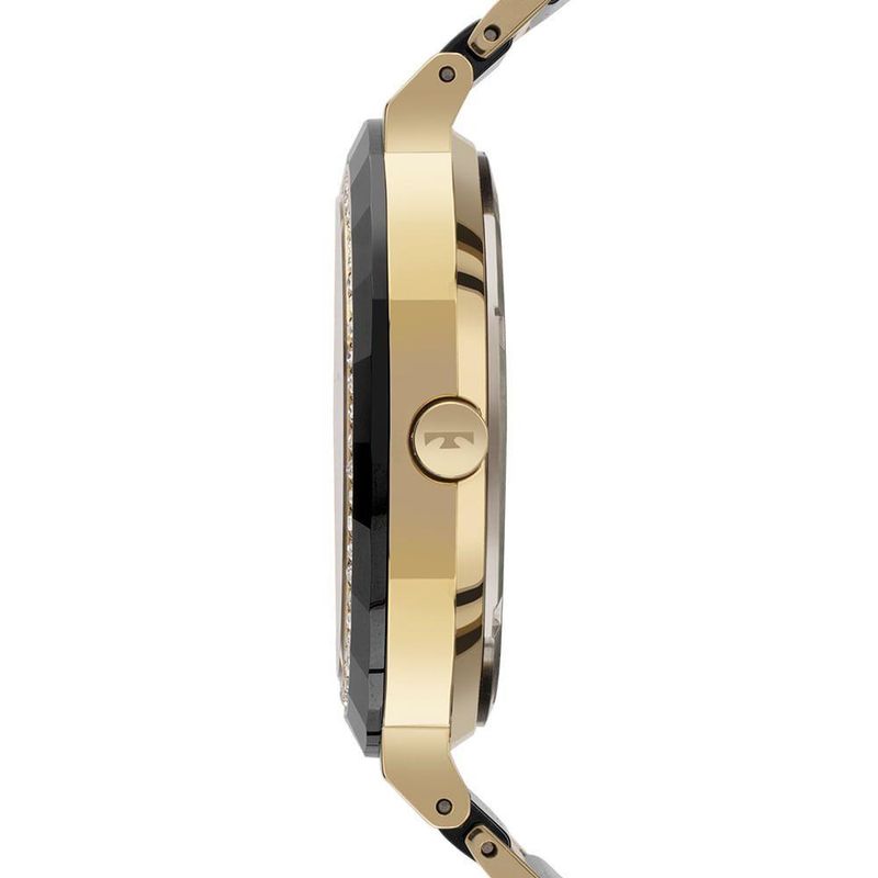 modelo da linha Ceramic, com aplicação de pedras no aro interno. Seu mostrador também apresenta aplicação de pedras nos marcadores de hora, além da elegante numeração romana e assinatura da linha. Seu diferencial está nos materiais utilizados em sua composição: feito em aço inoxidável em banho dourado, ele apresenta aplicação de cerâmica preta na pulseira e no aro externo, além de possuir Vidro de Safira, ambos altamente resistentes a riscos e arranhões. Produto com máquina quartz japonesa Miyota, tamanho de caixa 30mm e resistência à água de 50m.