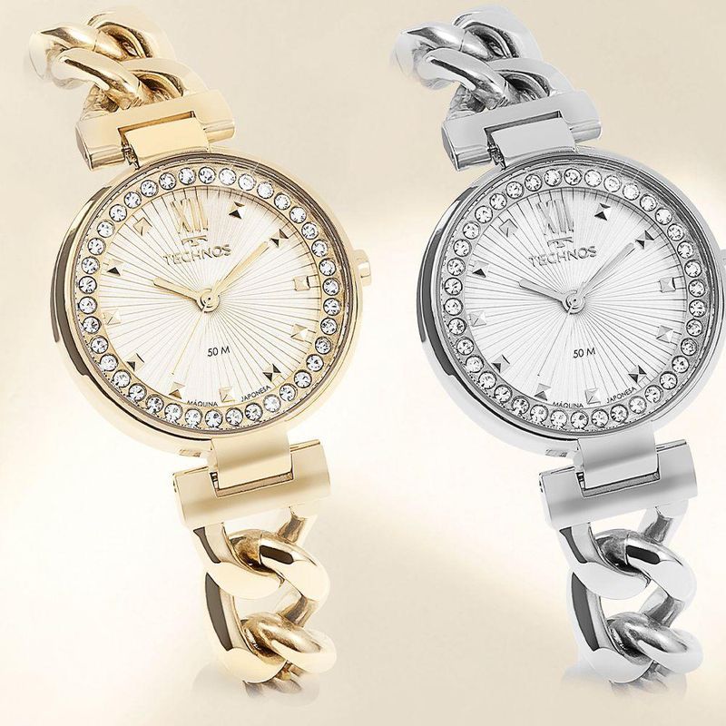 Relógio Technos Elos, com pedras aplicadas em todo o aro interno e uma sofisticada pulseira com elos sólidos entrelaçados. Seu mostrador apresenta aplicação de textura diferenciada, elegante numeração romana na posição de 12h e detalhes metálicos nos demais marcadores de hora. Produto 100% em aço inoxidável, com máquina quartz Japonesa Miyota e resistência à água de 50 metros.