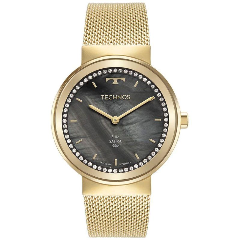 Relógio Technos Slim feminino em banho dourado, com design minimalista, moderno e sofisticado. Seu diferencial está no mostrador preto com aplicação de madre-pérola, assinatura de linha e pedras delicadas aplicadas no aro interno. Com caixa fina, pulseira mesh de aço e Vidro de safira com detalhe metalizado, é um relógio que, além de ser leve e confortável em qualquer pulso, um vidro com alta resistência a riscos e arranhões. Produto 100% em aço inoxidável, com máquina quartz Japonesa Miyota e resistência à água de 50m. Tamanho de caixa 38mm.