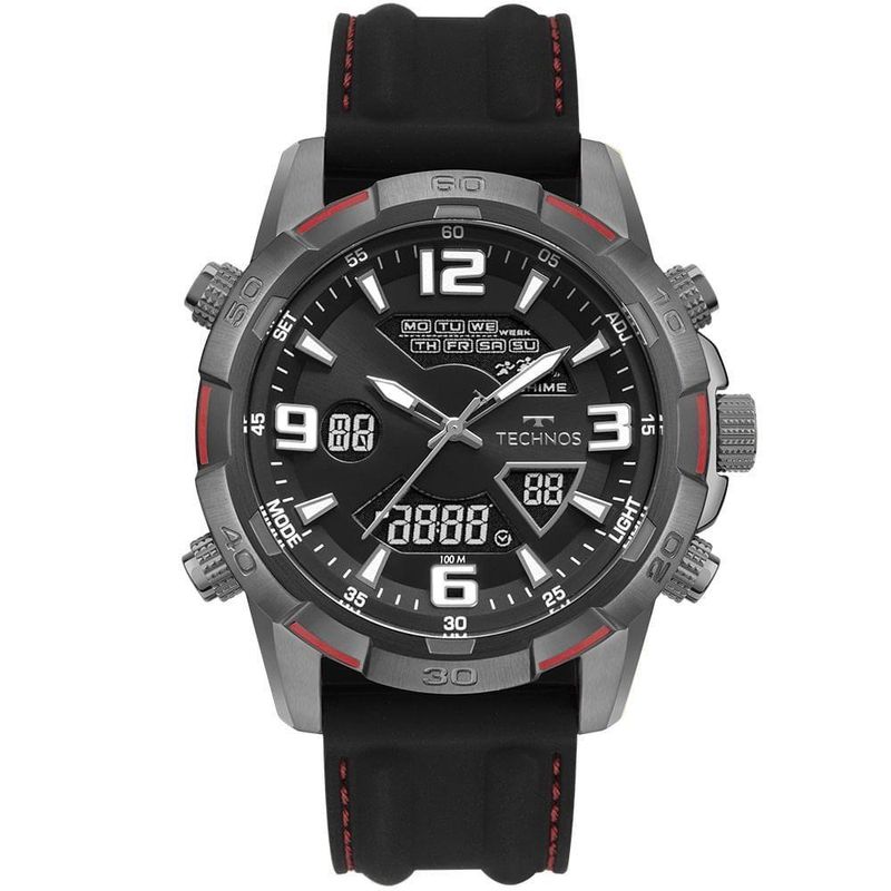 Relógio Technos Masculino com caixa de aço grafite robusta e aro trabalhado, e pulseira de silicone preta. Maquinismo anadigi com luz noturna. Perfeito para homens que gostam de relógios robustos. Resistência à água de 100m