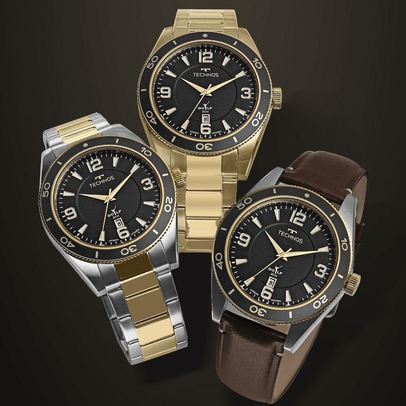 plaintext_description_meli - Relógio Technos Masculino Golf Bicolor - 2115TWK/1PNovas versões de modelo best-seller da linha Golf. Ele apresenta um elegante aro de alumínio com acabando fosco, mostrador preto e com a assinatura de linha. Material da caixa aço inoxidável, pulseiras disponíveis de aço inoxidável em 3 links ou couro na cor marrom, tamanho da caixa 45mm, resistência de até 50 metros na água, posição do calendário nas 6h disposníveis nos banhos dourado ou bicolor prata e dourado. Produto 100% em aço inoxidável, com máquina quartz japonesa Miyota.