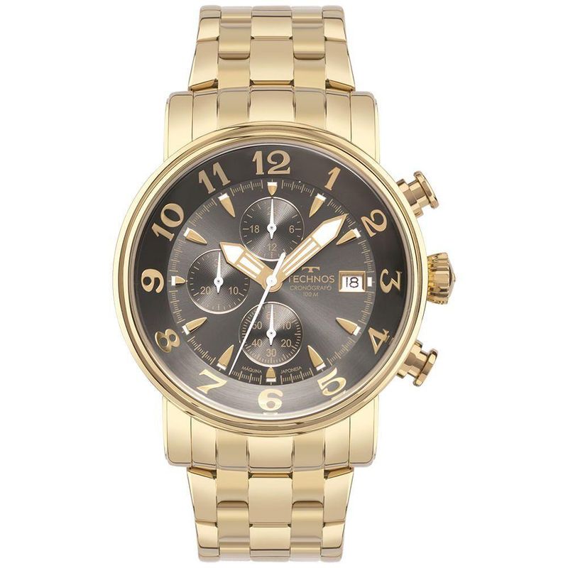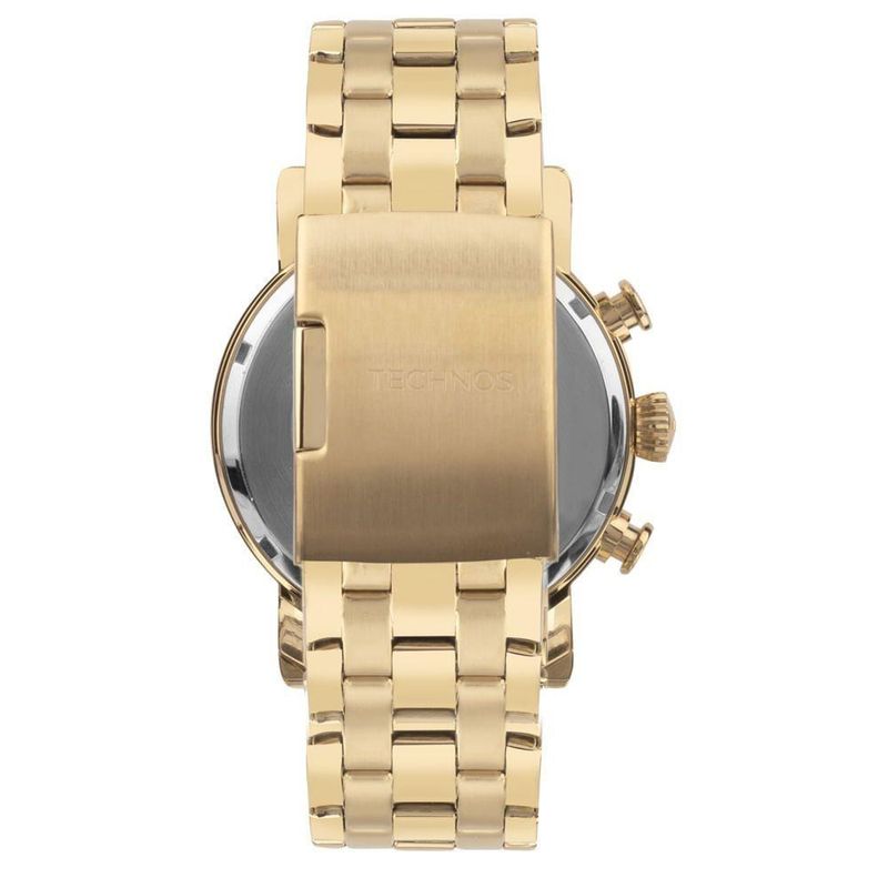 Relógio Technos Grandtech com acabamentos sofisticados, caixa elegante e mostrador imponente, rico em detalhes, com numeração arábica completa. Produto 100% em aço inoxidável em banho dourado, com diferenciada pulseira de 5 links, máquina quartz Japonesa Miyota, calendário, cronógrafo e resistência à água de 100m. Tamanho de caixa 44mm.