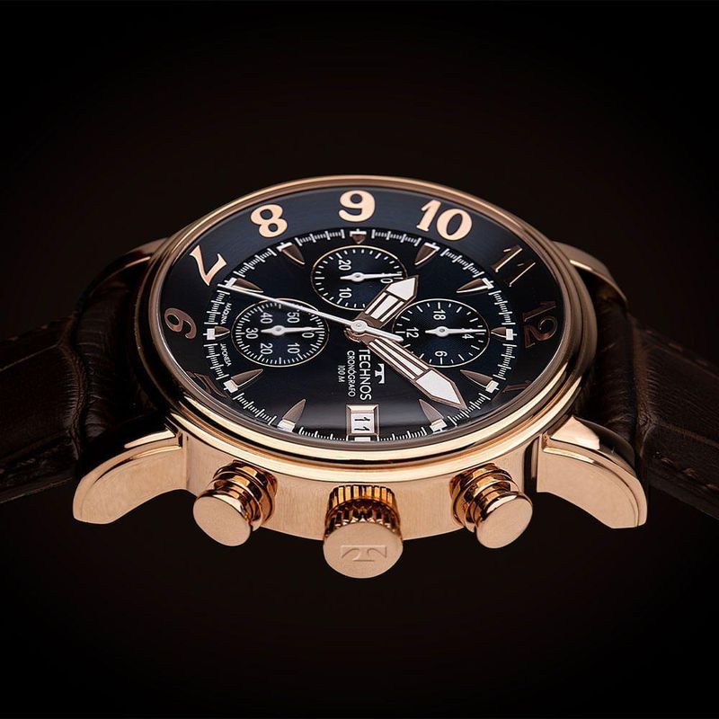 Relógio Technos Grandtech com acabamentos sofisticados, caixa elegante e mostrador azul imponente, rico em detalhes, com numeração arábica completa. Produto 100% em aço inoxidável em banho rosé, com diferenciada pulseira de couro legítimo na cor marrom, máquina quartz Japonesa Miyota, calendário, cronógrafo e resistência à água de 100m. Tamanho de caixa 44mm.