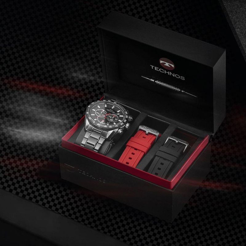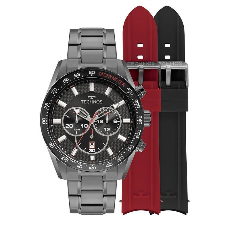 plaintext_description_meli - Relógio Technos Masculino Ts Carbon Grafite - JS25BBS/T1AReleitura de um modelo icônico da linha Carbon, agora na versão troca-pulseira. Além da pulseira de aço em 3 links, ele vem com duas pulseiras extras de silicone. É um relógio de design esportivo, inspirado no universo automobilístico. Seu mostrador é rico em detalhes, construído em duas camadas, com efeito de profundidade e aplicação de fibra de carbono. Produto 100% em aço inoxidável, com máquina quartz japonesa Miyota, calendário, cronógrafo e resistência à água de 100 metros. O conjunto acompanha um estojo especial, contendo o relógio, as duas pulseiras extras e uma ferramenta para realizar a troca.