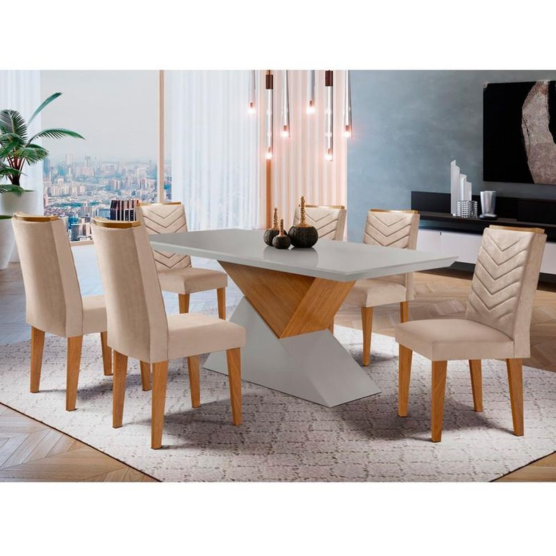 Sala de jantar Aster 180 Tampo em MDF Canto Reto com 6 Cadeiras Liz Moderna creme, off white e imbuiaQuando o assunto é jantar em casa, você não precisa se preocupar com nada além do cardápio, certo? Então, para que seus convidados se sintam em casa e ainda com aquele bom gosto, adquira o Conjunto de Mesa de Áster, um conjunto completo com tudo o que você precisa para o evento perfeito: 6 cadeiras confortáveis, com detalhes de costuras além de um puxador para dar um toque especial de charme; tampo muito bem dimensionado e design um inovador e chamativo. Além do visual moderno, a combinação de cores também resulta em um móvel louvável que será palco de belos momentos.