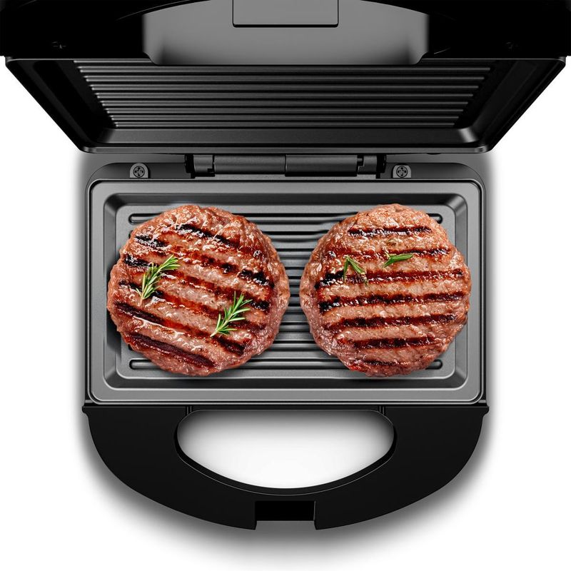 Este modelo 2 em 1 funciona como sanduicheira e grill, perfeito para preparar sanduíches crocantes, carnes suculentas e até vegetais grelhados com facilidade.