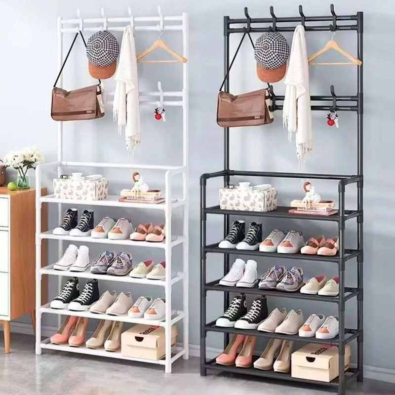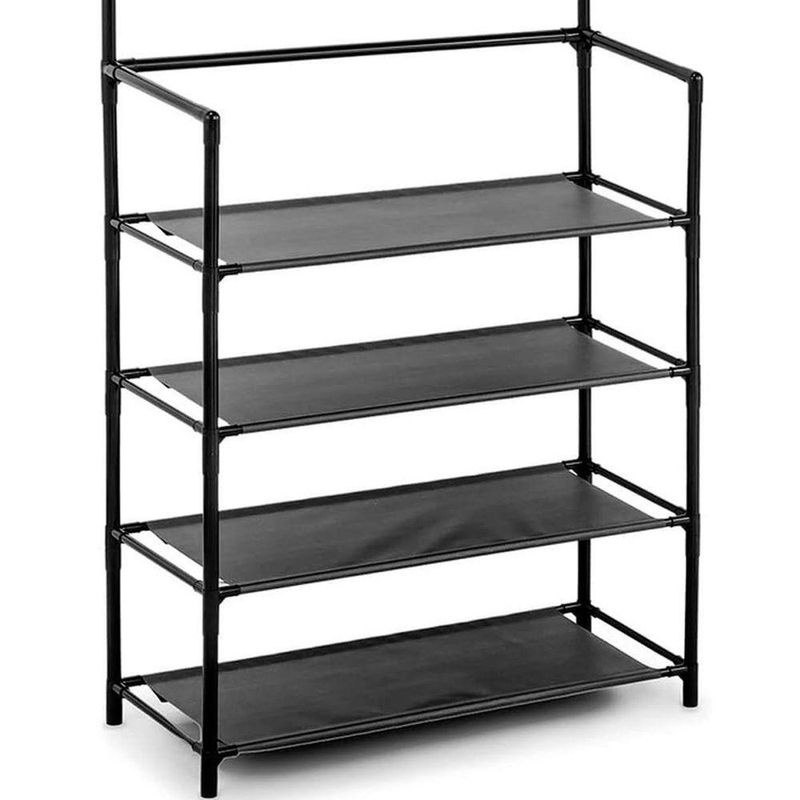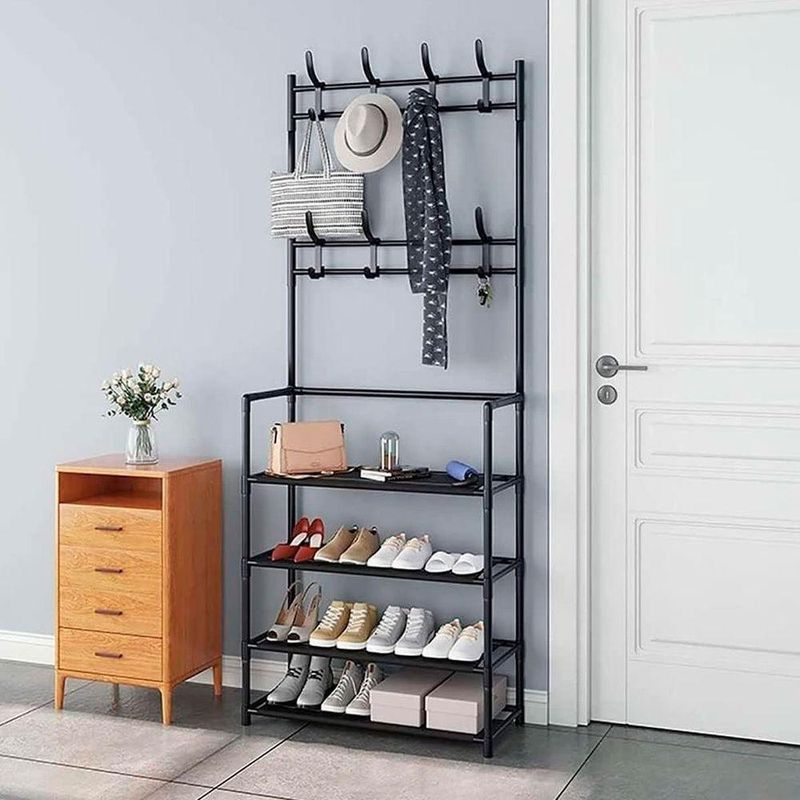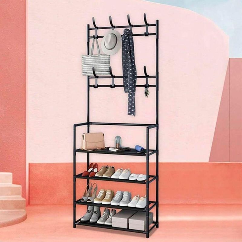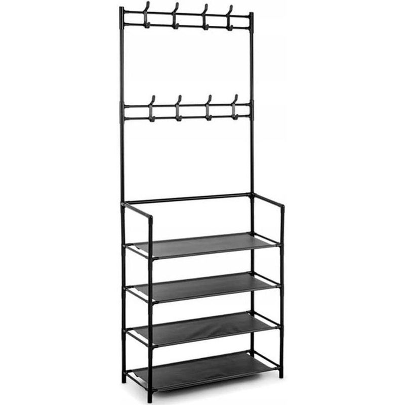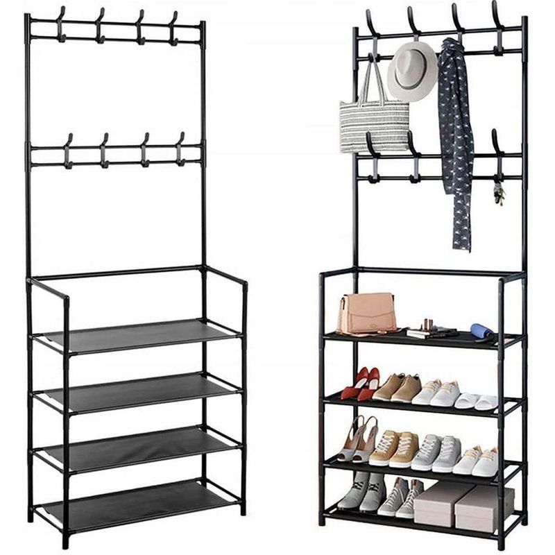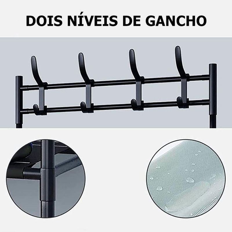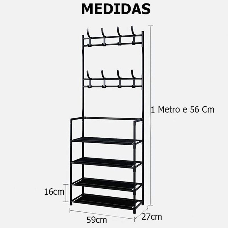 - Espaçosa e Multifuncional: Com 4 andares de prateleiras, oferece amplo espaço para a organização de seus calçados. Além disso, conta com 8 ganchos duplos distribuídos em 2 níveis, permitindo pendurar bolsas, chapéus, lenços e outros acessórios.