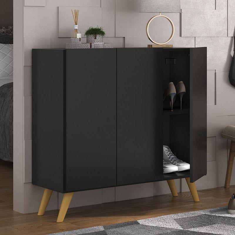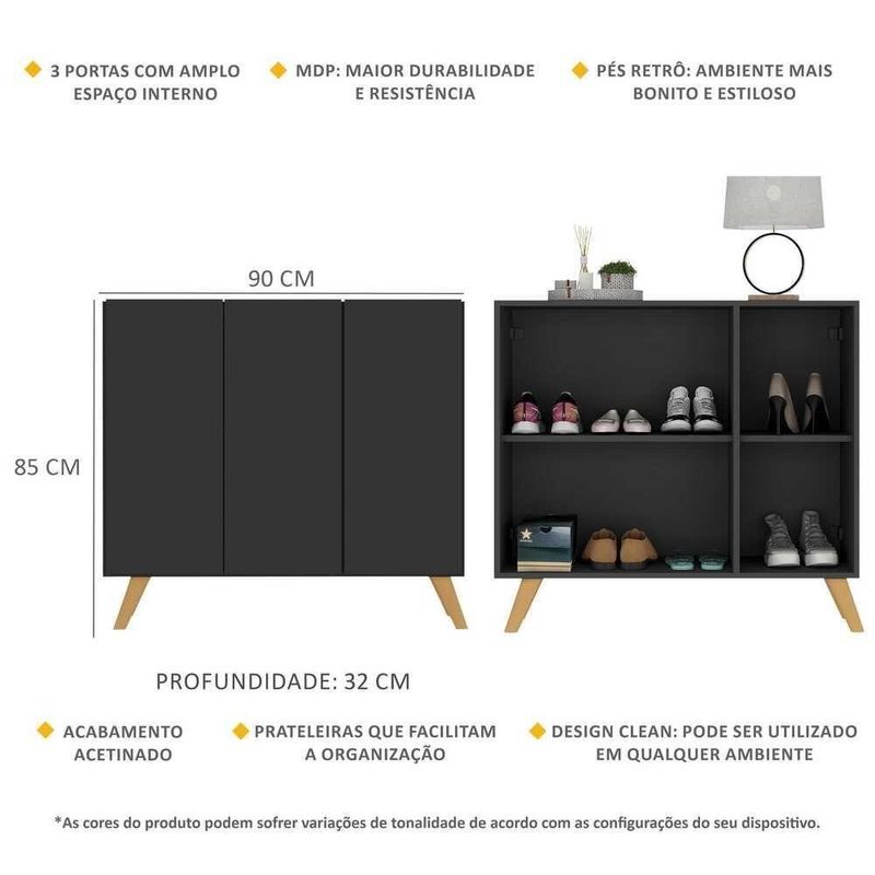 A Sapateira Retrô 3 Portas Nina Multimóveis é produzida em MDP com acabamento acetinado (cerca de 20% de brilho), que garante maior durabilidade, facilidade na limpeza, além de um acabamento superior. Com 3 portas, possui um excelente espaço interno para acomodar seus sapatos e demais pertences (as prateleiras internas suportam 2 e 5 Kg e o tampo 7 Kg). Os pés retrô, em polipropileno, dão um charme especial ao móvel deixando-o com um visual leve e permitindo você compor um ambiente com ar vintage e moderno ao mesmo tempo. Compacta, é uma excelente opção para otimizar seu ambiente, para que você possa aproveitá-lo da melhor maneira possível.