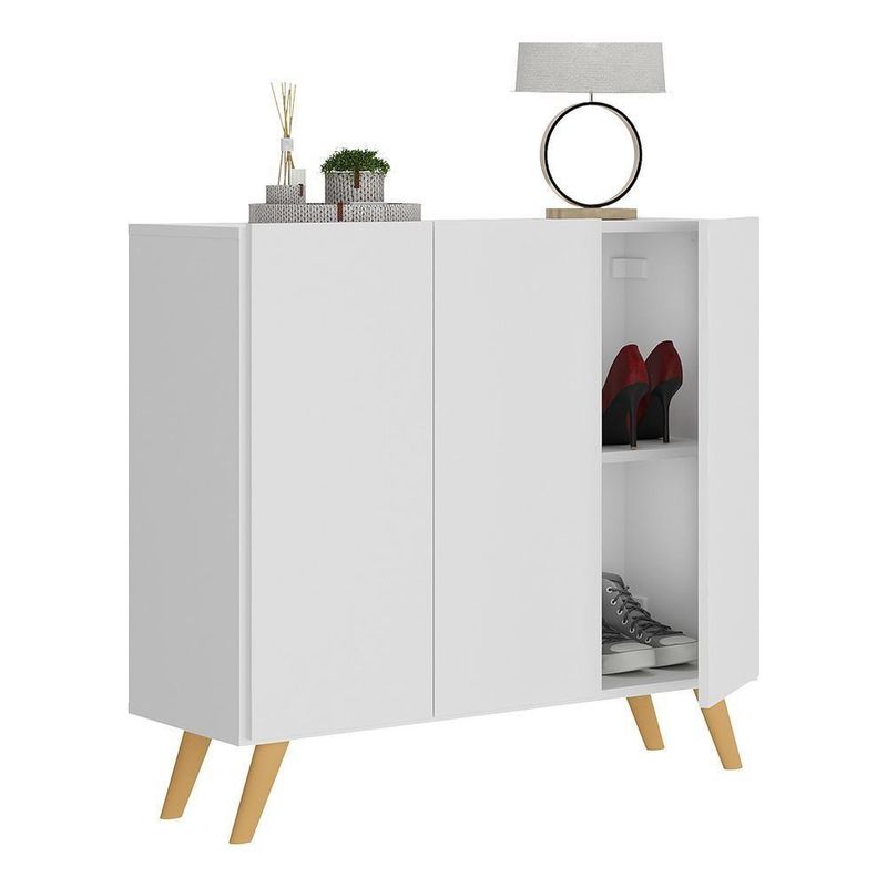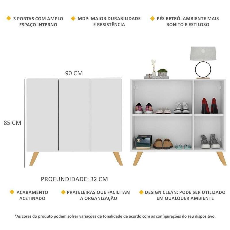 A Sapateira Retrô 3 Portas Nina Multimóveis é produzida em MDP com acabamento acetinado (cerca de 20% de brilho), que garante maior durabilidade, facilidade na limpeza, além de um acabamento superior. Com 3 portas, possui um excelente espaço interno para acomodar seus sapatos e demais pertences (as prateleiras internas suportam 2 e 5 Kg e o tampo 7 Kg). Os pés retrô, em polipropileno, dão um charme especial ao móvel deixando-o com um visual leve e permitindo você compor um ambiente com ar vintage e moderno ao mesmo tempo. Compacta, é uma excelente opção para otimizar seu ambiente, para que você possa aproveitá-lo da melhor maneira possível.