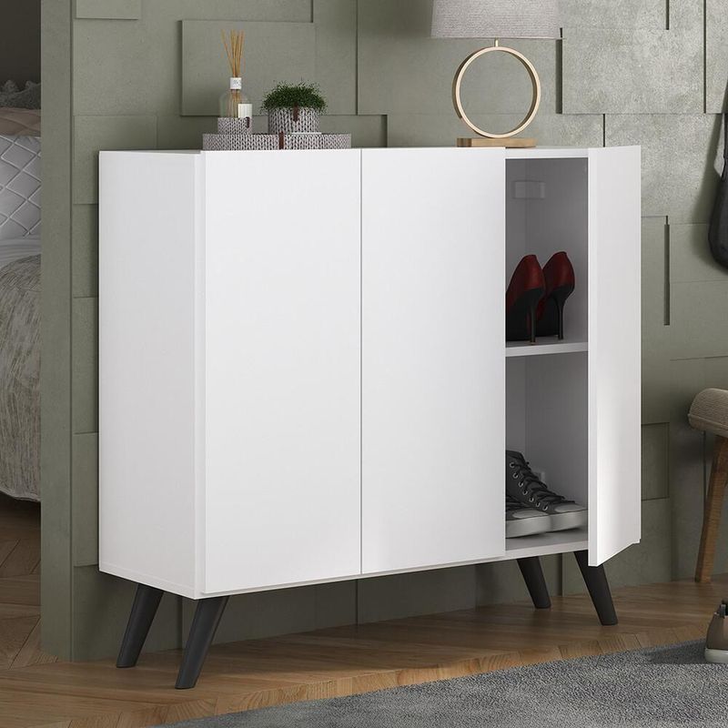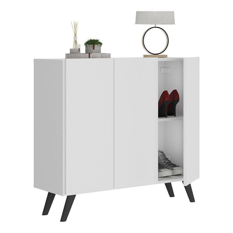 A Sapateira Retrô 3 Portas Nina Multimóveis é produzida em MDP com acabamento acetinado (cerca de 20% de brilho), que garante maior durabilidade, facilidade na limpeza, além de um acabamento superior. Com 3 portas, possui um excelente espaço interno para acomodar seus sapatos e demais pertences (as prateleiras internas suportam 2 e 5 Kg e o tampo 7 Kg). Os pés retrô, em polipropileno, dão um charme especial ao móvel deixando-o com um visual leve e permitindo você compor um ambiente com ar vintage e moderno ao mesmo tempo. Compacta, é uma excelente opção para otimizar seu ambiente, para que você possa aproveitá-lo da melhor maneira possível.