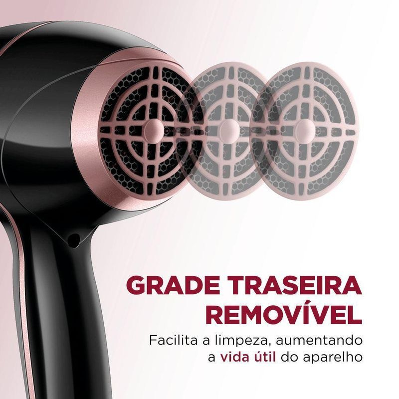 GRADE TRASEIRA REMOVÍVEL: Facilita a limpeza e aumenta a durabilidade do secador.