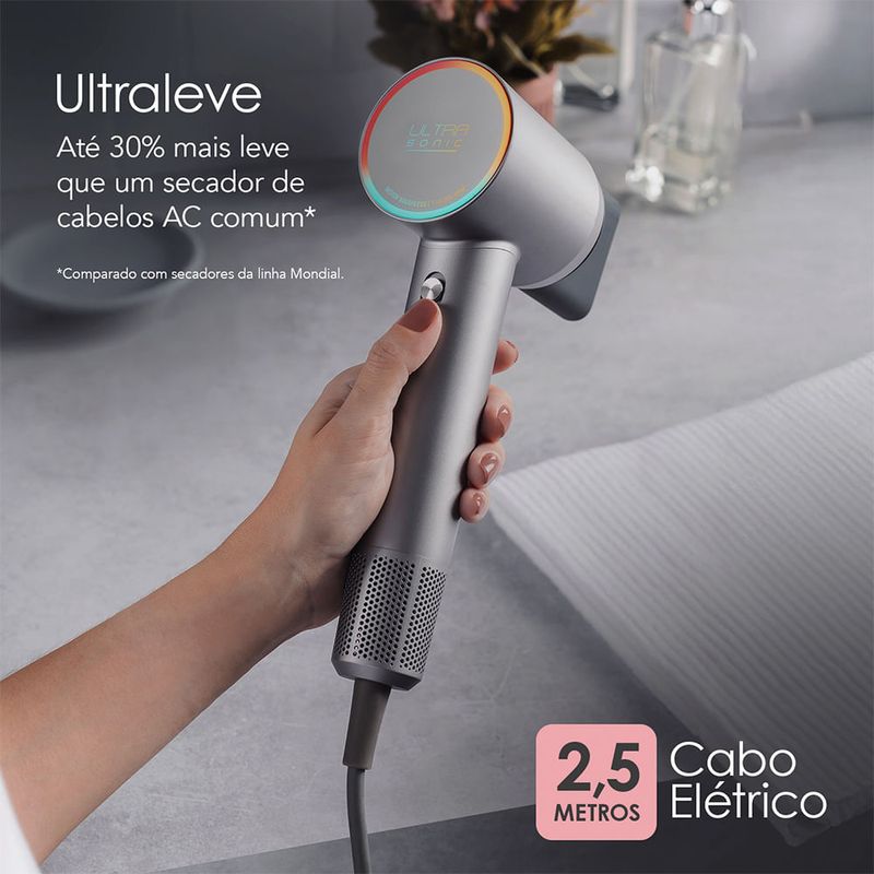 Novo Design: Leve e sofisticado, o secador Ultra Sonic oferece conforto no uso prolongado. Os acessórios magnéticos, incluindo o suporte de parede, facilitam o armazenamento e o manuseio no dia a dia.
