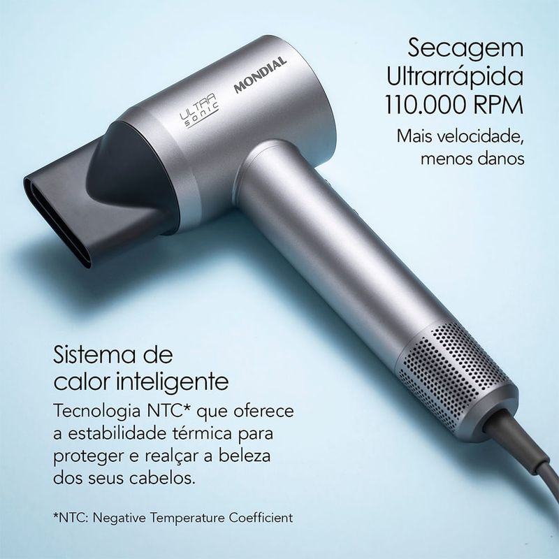 E para deixar os fios saudáveis, macios e sedosos, o Secador de Cabelos Mondial tem gerador de íons negativos, que reduz o frizz e aumenta o brilho dos cabelos, e conta com a tecnologia NTC para regular automaticamente a temperatura, proporcionando uma secagem segura e eficiente.