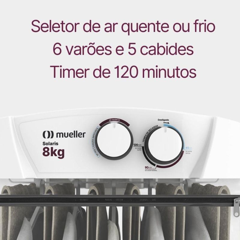 A secadora Mueller Solaris é robusta, feita com materiais resistentes como PVC na câmara de secagem e plástico especial no gabinete, garantindo durabilidade ao uso diário e à exposição ao calor.Otimize suas tarefas de casa!