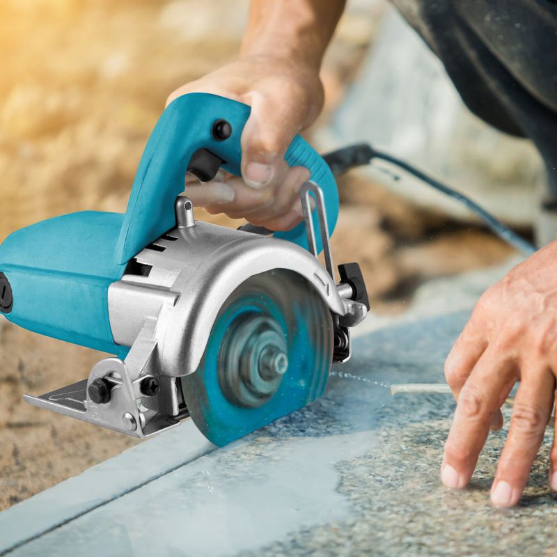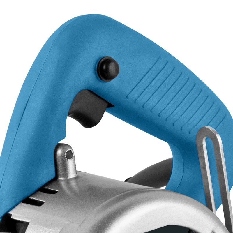 Pode se usar disco diamantado de até 4.3/8" com disco diamantado 110 mm segmentado para corte de mármores, granitos e pedras. Junto com a serra mármore acompanha uma chave para fazer a troca do disco. Sua estrutura é compacta, leve e portátil.