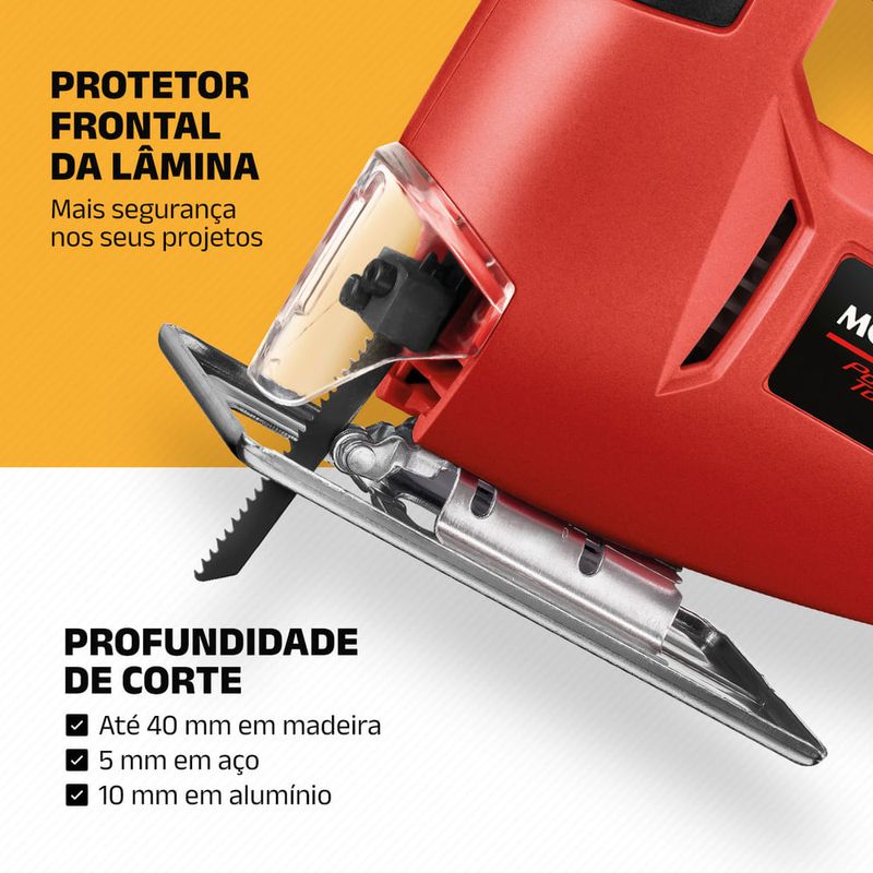 Profundidade de Corte: Indicada para cortar até 40 mm em madeira 5 mm em aço e 10 mm em alumínio.
