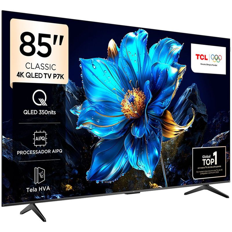 A Smart TV 85 TCL, 4K UHD, QLED, Google TV - 85P7K traz o melhor da tecnologia para a sua TV. O aparelho possui resolução 4K UHD, que eleva o nível das suas imagens. Com 85 polegadas, a smart TV possui um ótimo tamanho para você assistir ao que mais gosta. O sistema operacional Google TV possibilita baixar aplicativos para assistir filmes, séries e o que você precisar. A tela com painel QLED transmite as imagens com muito mais cor e resolução. Graças ao processador AIPQ, você assiste tudo com qualidade de imagem inigualável. Não perca essa oportunidade e garanta já a sua!