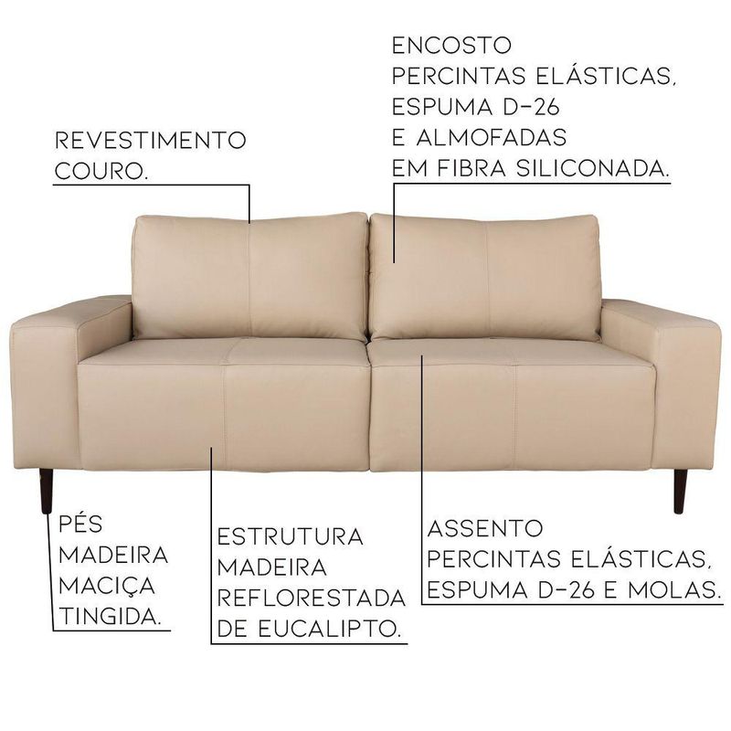 É Bipartido: Sim Revestimento: Couro; Peso Suportado: 100Kg Cada Assento; Conteúdo da Embalagem: 1 Sofá; Necessita de Montagem: Não; Instruções/Cuidado: Utilizar um pano levemente umedecido com água, seguido de pano seco. Evitar exposição ao sol, para que o produto não sofra alterações na cor. Não limpar com escovas ou produtos abrasivos. Observações importantes: - As imagens são meramente ilustrativas e não acompanham objetos de decoração e eletros. - Pode haver alguma diferença de tonalidade entre a imagem e o produto, por conta do tratamento de imagens e a calibração de cores da sua tela. - Todos os nossos produtos são enviados devidamente embalados e com total segurança. - Ao receber o produto o cliente deve verificar as condições da embalagem, havendo alguma avaria não assine o comprovante de recebimento, entre em contato com a loja para orientações. - A nossa loja se responsabilizará pela entrega dos produtos adquiridos até a porta de entrada ou portaria do endereço indicado. - Não nos responsabilizamos, no ato da entrega, por montagens, desmontagens e instalações de produtos, bem como, por subir ou descer escadas/elevadores ou pela utilização de guinchos ou equipamentos similares para acesso a pisos superiores em apartamentos, casas ou escritórios. Estas despesas adicionais serão de responsabilidade do cliente. - Confira as dimensões do produto no momento da compra e certifique-se de que passará normalmente por elevadores, portas, escadas e/ou corredores, evitando assim futuros desagrados ou imprevistos com a entrega do produto.