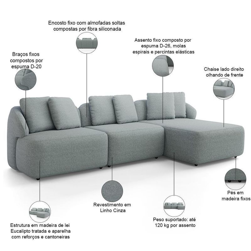 Sofá 3 Lugares Com Chaise Direito Sala Living 254cm Arlo F04 Linho Cinza - Lyam Decor