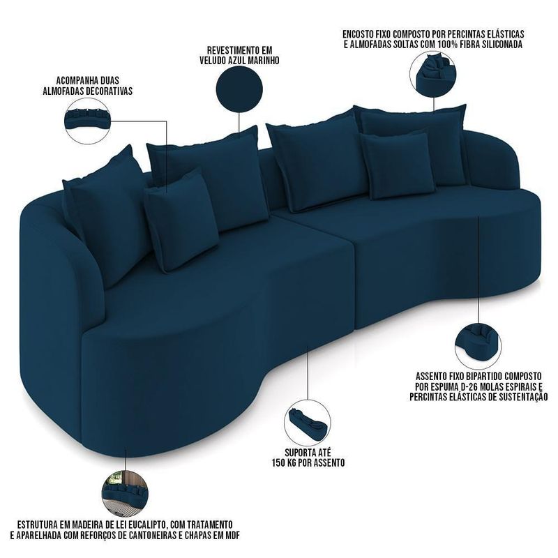 Sofá 3 Lugares Orgânico Sala De Estar Living 230cm Ekos K01 Veludo Azul Marinho - Lyam Decor