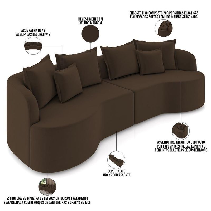Sofá 3 Lugares Orgânico Sala De Estar Living 230cm Ekos K01 Veludo Marrom - Lyam Decor