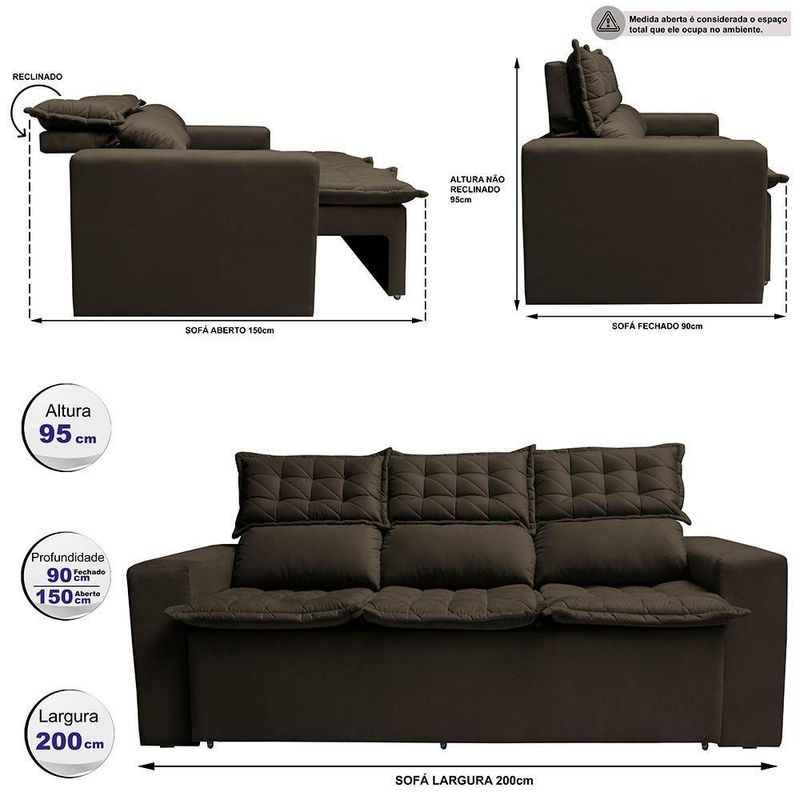 Sofá 3 Lugares Retrátil E Reclinável Cama Inbox Slim 2,00m Velusoft Café