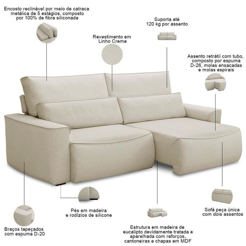Sofá 3 Lugares Retrátil Reclinável Para Sala De Estar 210cm Odilon F04 Linho Creme - Lyam Decor