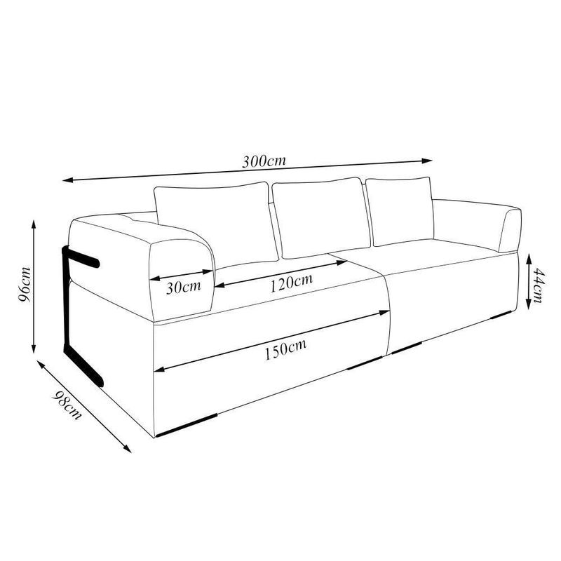 - Confira as dimensões do produto no momento da compra e certifique-se de que passará normalmente por elevadores, portas, escadas e/ou corredores, evitando assim futuros desagrados ou imprevistos com a do produto. Altura do Produto (cm): 96 | Comnto do Produto (cm): 98 | Largura do Produto (cm): 300