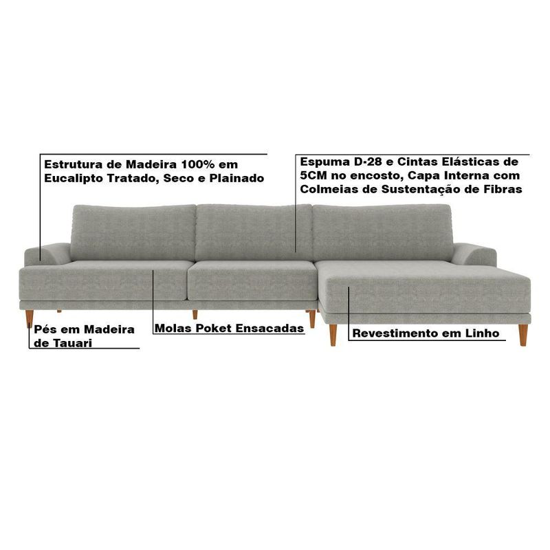 Sofá com Chaise Direita 384cm Índico Linho Cinza Gran Belo
