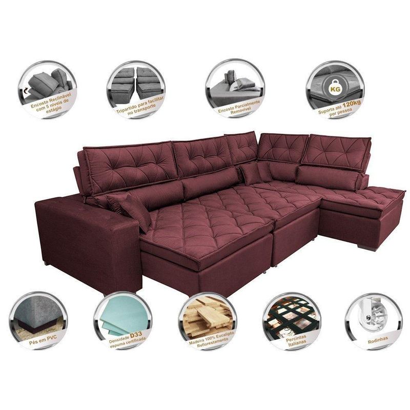 Sofá De Canto Retrátil E Reclinável Direito 3,00x2,36m Molas Cama Inbox Espanha Velusoft Vinho