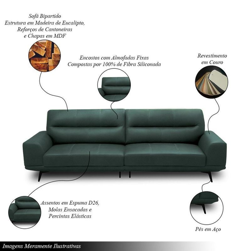 Sofá Decorativo Ashton 3 Lugares Sala De Estar 256cm Pés Em Aço Couro Verde Musgo G88 - Gran Belo