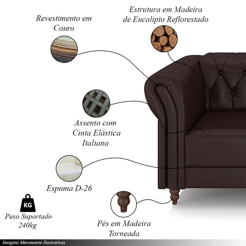 Transforme sua sala de estar com o Sofá Stanford Estilo Chesterfield, uma peça icônica que combina sofisticação e conforto em um design atemporal. Este elegante sofá é a escolha perfeita para quem busca não apenas um móvel, mas uma verdadeira obra de arte para o ambiente.Fabricado com madeira reflorestada de eucalipto, o Sofá Stanford garante durabilidade e resistência, respeitando o meio ambiente ao mesmo tempo.O encosto e os braços são preenchidos com fibra siliconada, oferecendo um toque macio e aconchegante, enquanto o assento é equipado com cinta elástica italiana tensionada e almofada ensacada de espuma D-26. Esta combinação proporciona um suporte excepcional e conforto duradouro.O revestimento em couro confere um aspecto luxuoso e elegante, refletindo o estilo clássico Chesterfield. Seus pés torneados fixos, em madeira maciça, adicionam um charme adicional e garantem estabilidade.Com a impressionante capacidade de suportar até 240 kg, o Sofá Stanford é ideal para uso diário e acomoda confortavelmente todos os membros da família.Este sofá é a escolha ideal para quem aprecia o charme vintage e a qualidade superior dos móveis. Com seu design imponente e detalhes refinados, o Sofá Stanford Estilo Chesterfield será o ponto focal de qualquer sala de estar, oferecendo um ambiente elegante e acolhedor.