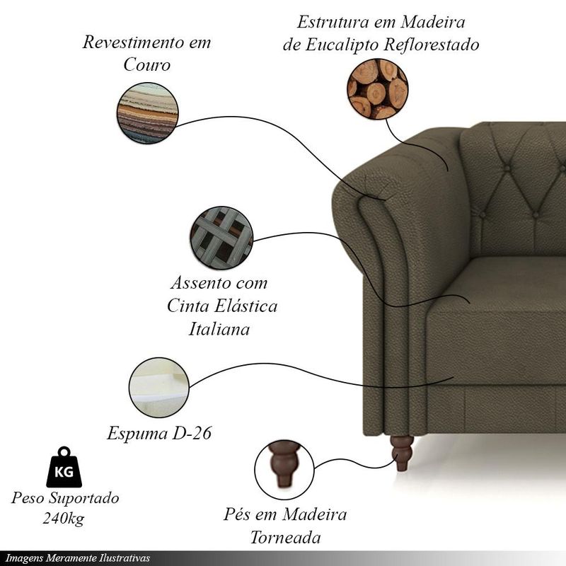 Transforme sua sala de estar com o Sofá Stanford Estilo Chesterfield, uma peça icônica que combina sofisticação e conforto em um design atemporal. Este elegante sofá é a escolha perfeita para quem busca não apenas um móvel, mas uma verdadeira obra de arte para o ambiente.Fabricado com madeira reflorestada de eucalipto, o Sofá Stanford garante durabilidade e resistência, respeitando o meio ambiente ao mesmo tempo.O encosto e os braços são preenchidos com fibra siliconada, oferecendo um toque macio e aconchegante, enquanto o assento é equipado com cinta elástica italiana tensionada e almofada ensacada de espuma D-26. Esta combinação proporciona um suporte excepcional e conforto duradouro.O revestimento em couro confere um aspecto luxuoso e elegante, refletindo o estilo clássico Chesterfield. Seus pés torneados fixos, em madeira maciça, adicionam um charme adicional e garantem estabilidade.Com a impressionante capacidade de suportar até 240 kg, o Sofá Stanford é ideal para uso diário e acomoda confortavelmente todos os membros da família.Este sofá é a escolha ideal para quem aprecia o charme vintage e a qualidade superior dos móveis. Com seu design imponente e detalhes refinados, o Sofá Stanford Estilo Chesterfield será o ponto focal de qualquer sala de estar, oferecendo um ambiente elegante e acolhedor.