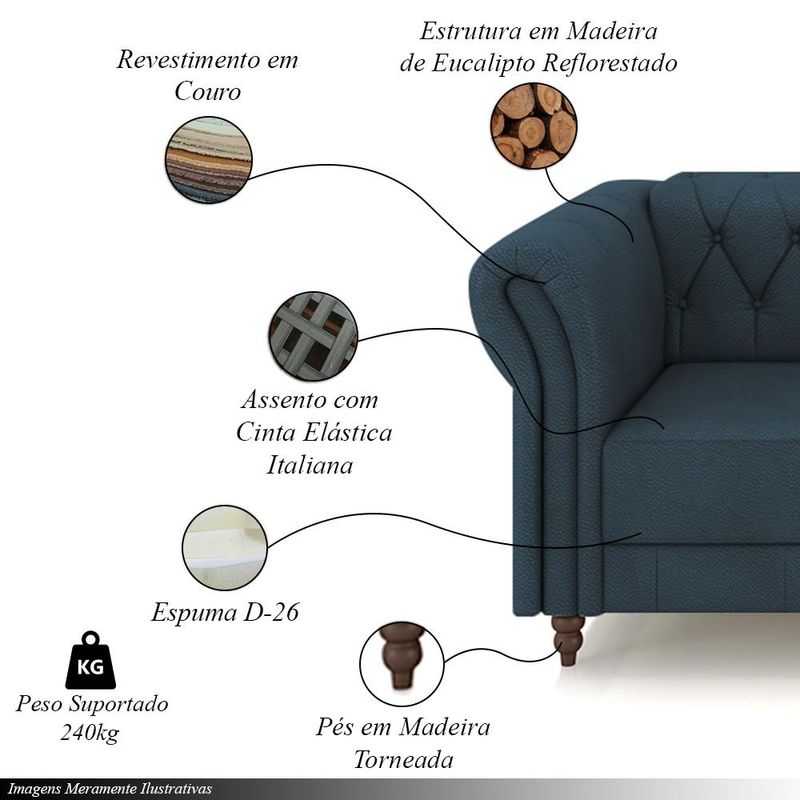 Transforme sua sala de estar com o Sofá Stanford Estilo Chesterfield, uma peça icônica que combina sofisticação e conforto em um design atemporal. Este elegante sofá é a escolha perfeita para quem busca não apenas um móvel, mas uma verdadeira obra de arte para o ambiente.Fabricado com madeira reflorestada de eucalipto, o Sofá Stanford garante durabilidade e resistência, respeitando o meio ambiente ao mesmo tempo.O encosto e os braços são preenchidos com fibra siliconada, oferecendo um toque macio e aconchegante, enquanto o assento é equipado com cinta elástica italiana tensionada e almofada ensacada de espuma D-26. Esta combinação proporciona um suporte excepcional e conforto duradouro.O revestimento em couro confere um aspecto luxuoso e elegante, refletindo o estilo clássico Chesterfield. Seus pés torneados fixos, em madeira maciça, adicionam um charme adicional e garantem estabilidade.Com a impressionante capacidade de suportar até 240 kg, o Sofá Stanford é ideal para uso diário e acomoda confortavelmente todos os membros da família.Este sofá é a escolha ideal para quem aprecia o charme vintage e a qualidade superior dos móveis. Com seu design imponente e detalhes refinados, o Sofá Stanford Estilo Chesterfield será o ponto focal de qualquer sala de estar, oferecendo um ambiente elegante e acolhedor.