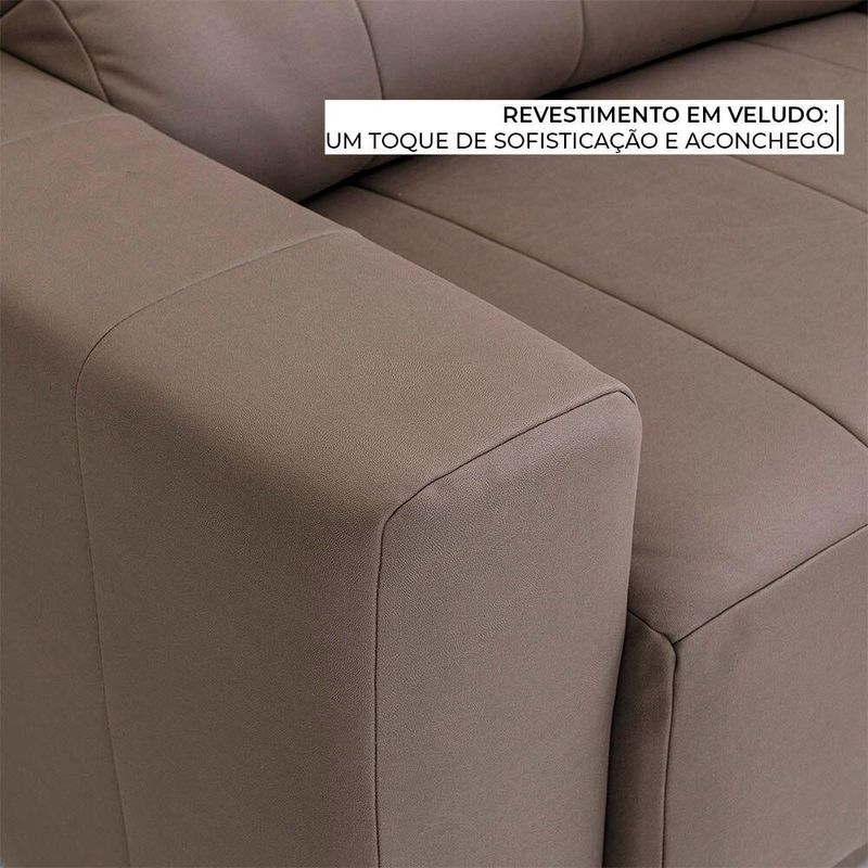 ESPECIFICAÇÕES Revestimento: Tecido Veludo 100% poliéster Estrutura: Madeira de reflorestamento, cola PVA e grampos de aço. Material dos pés: Sapatas plásticas. Encosto: Almofadas fixas preenchidas com fibra poliéster e mecanismo reclinável. Assentos: Retrátil, com cintas elásticas, espuma de densidade D26 e espuma de densidade D16.