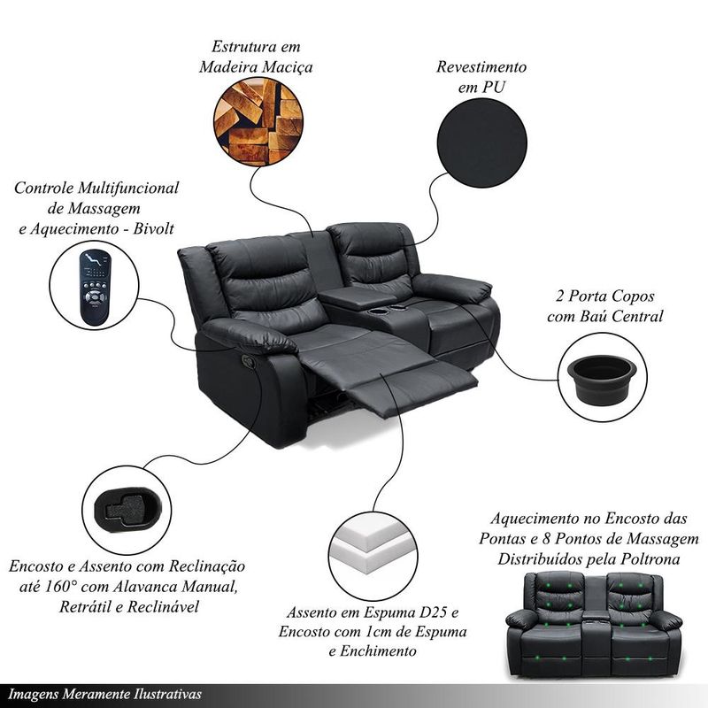 Com Encostos e Assentos Reclináveis até 160°, ajustáveis por Alavanca Manual, permite encontrar a posição ideal para relaxar. Os Assentos Retráteis oferecem Máximo Conforto para as pernas. O estofamento em Espuma D25 e Enchimento Extra nos Encostos equilibra Maciez e Suporte. Massagem e Aquecimento para Relaxamento Total