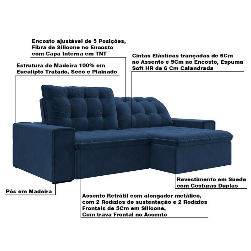 Sofá Retrátil 274cm Gabi Suede Azul Marinho Gran Belo