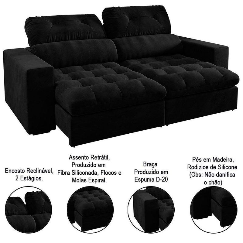 Sofá Retrátil E Reclinável 3 Lugares 200cm Viena A12 Suede Preto - Mpozenato