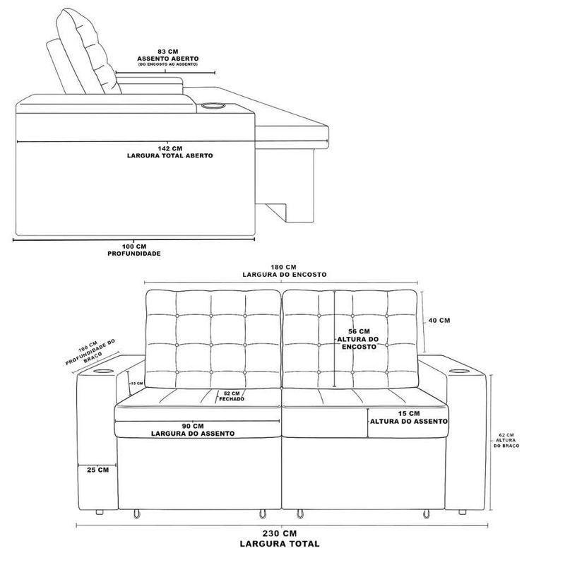 Profundidade do assento aberto: 83 cm