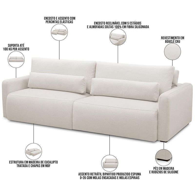 Sofá Retrátil Reclinável Para Sala De Estar Living 240cm Sevilha F04 Bouclê Cru - Lyam Decor