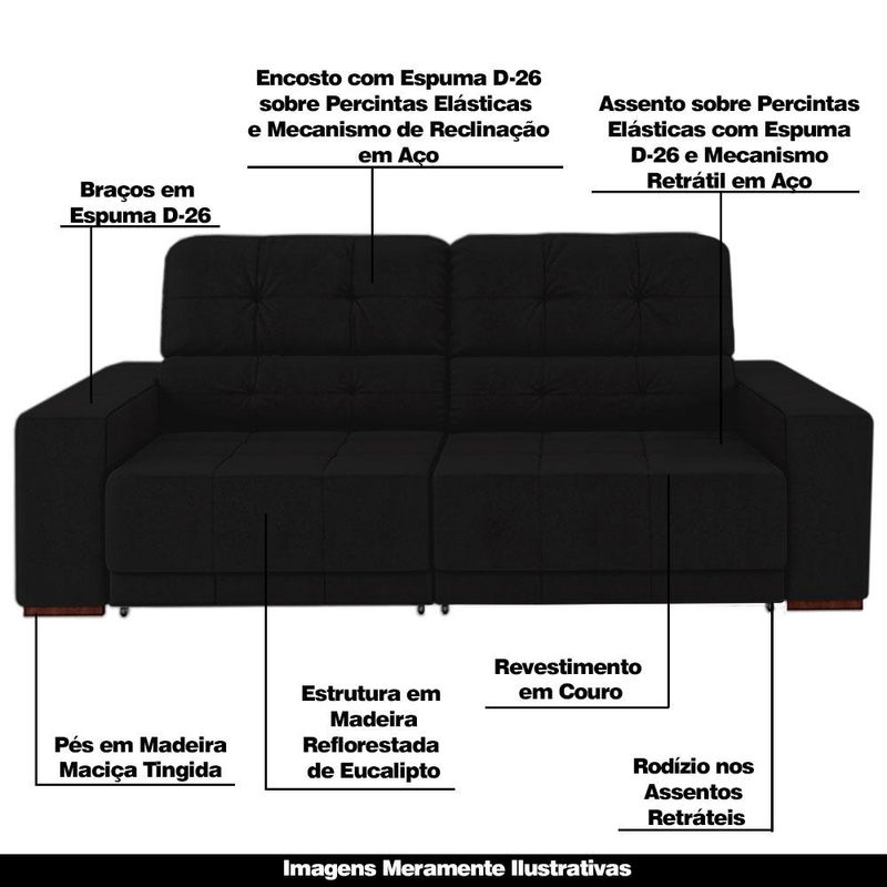Sofá Sala de Estar Retrátil e Reclinável 3 Lugares Lisboa 210cm Preto Couro - Gran Belo é um sofá retrátil e reclinável, uma excelente escolha para quem gosta de reunir os amigos em casa ou assistir filmes com a família, pois esse móvel é espaçoso, confortável e fica como uma cama quando usado na sua capacidade total da abertura do assento. Por ser revestido de couro garantimos longa durabilidade e resistência, compre já o seu e deixe o espaço elegante e aconchegante!