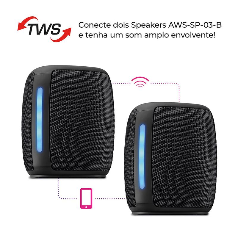 Som portátil: Com 15W RMS de potência, o Speaker AWS-SP-03-BL oferece um som claro e equilibrado, com uma boa resposta de graves e agudos.