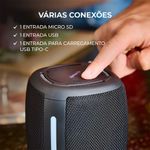 Múltiplas conexões: A caixa de som portátil comporta três conexões: cartão de memória, entrada USB e outra para carregamento USB Tipo-C.